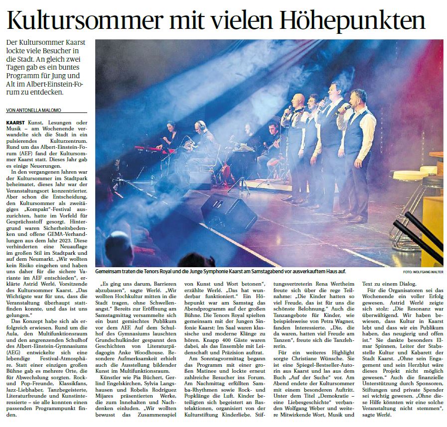 Der Vorstand des Kultursommer Kaarst e.V. (KSK) hat zusammen mit dem Kulturamt der Stadt Kaarst die Durchführung des 3. Kultursommer Kaarst 2025 vereinbart. Am 23. und 24. August 2025 wird in und um das Albert-Einstein-Forum (AEF) der Kultursommer Kaarst 2025 Kompakt stattfinden. Kompakt bedeutet hier: Wir reduzieren die Zeit auf zwei Tage und verlegen den Veranstaltungsort aus dem Stadtpark ins AEF und den angrenzenden Schulhof des AEG.